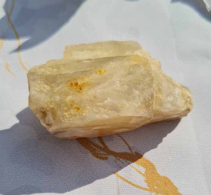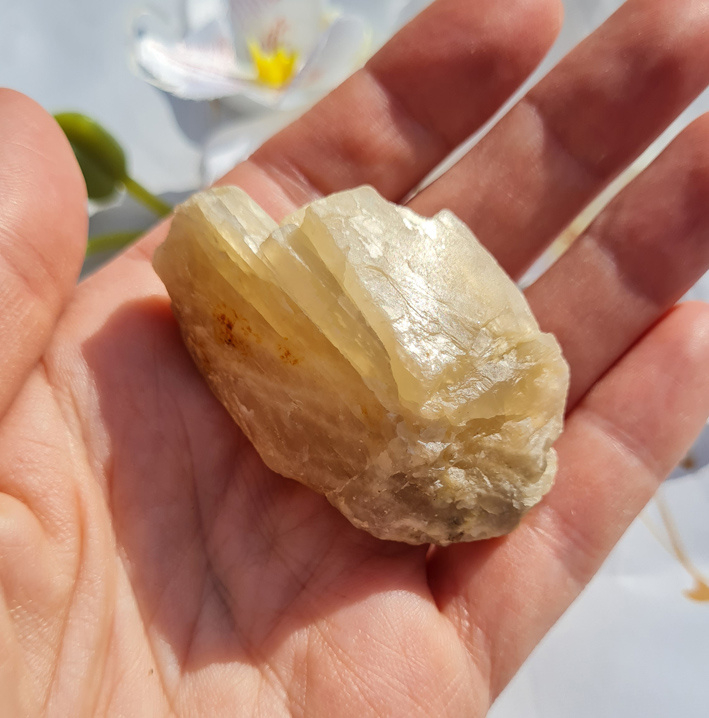 De kleur van deze mooie steen is crème en beige met een mooie parelmoer glans en wat grijze tinten binnenin. Heeft enkele kleine ijzerhoudende plekjes.