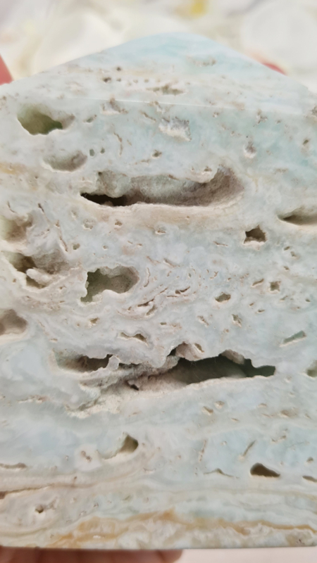 - Materiaal: Zeeblauwe calciet met witte en lichtbruine aragoniet