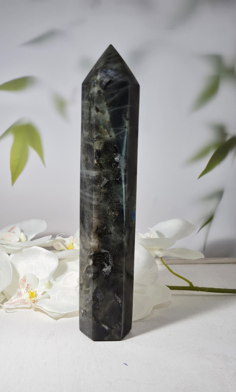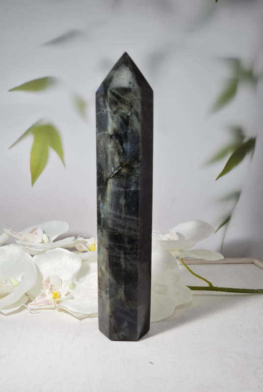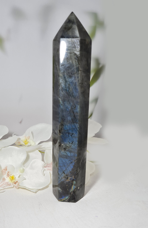 OverzichtEen prachtige Labradoriet punt met een blauwe gloed.