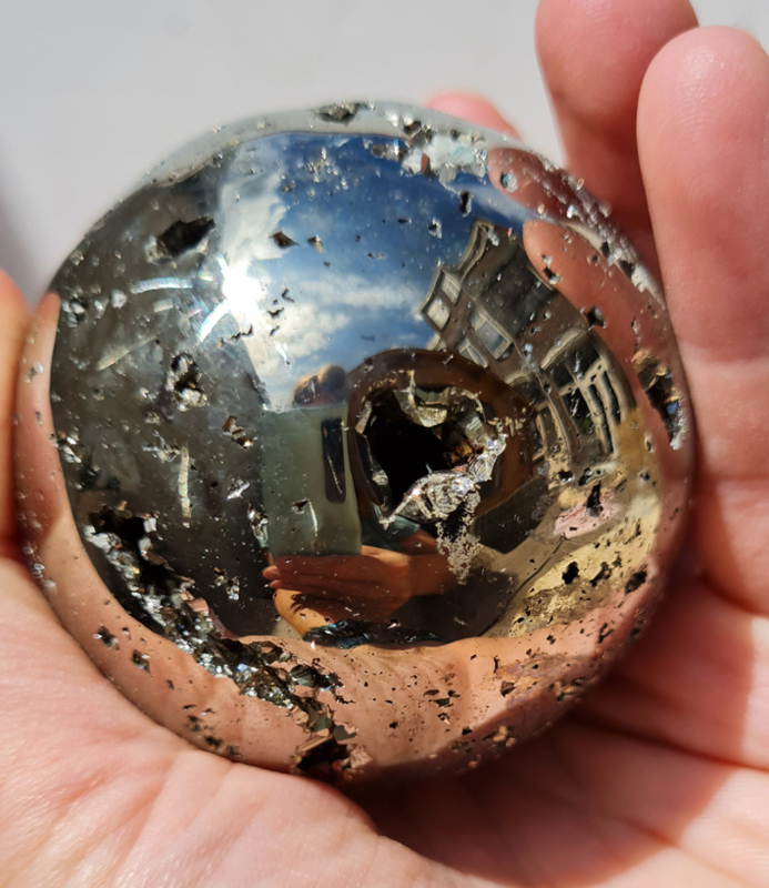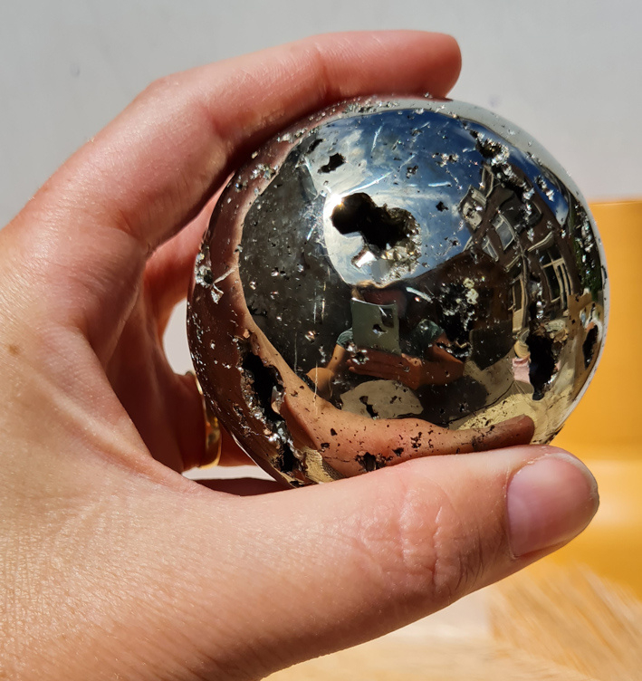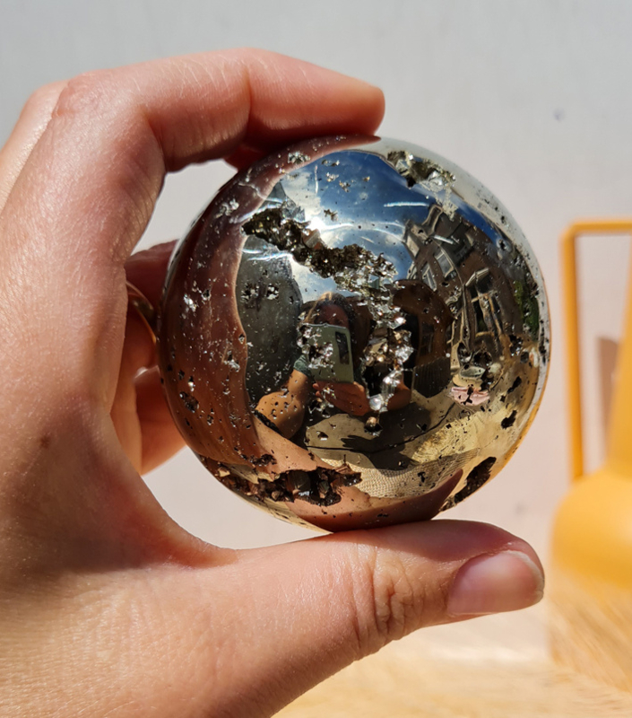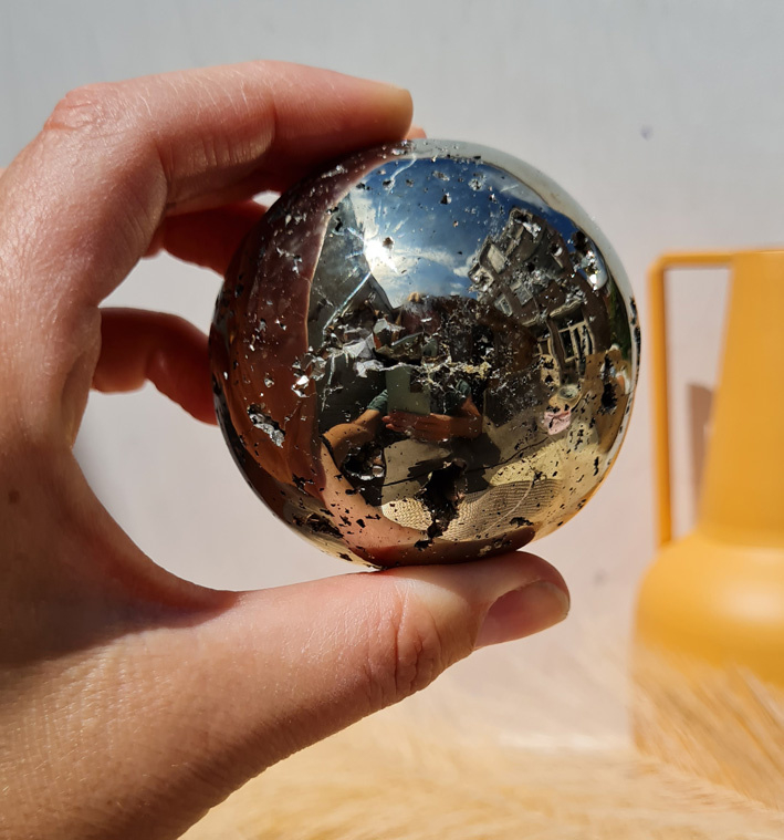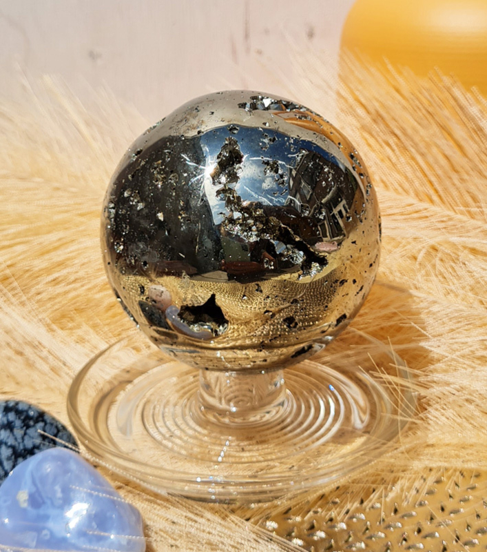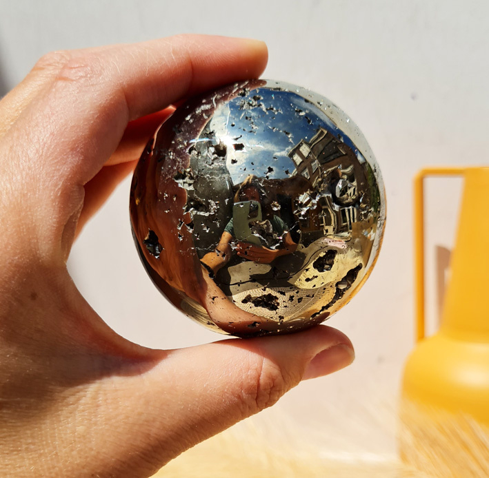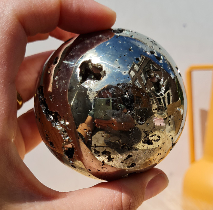Deze mooi glanzende, Pyriet bol komt uit Peru.