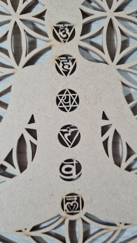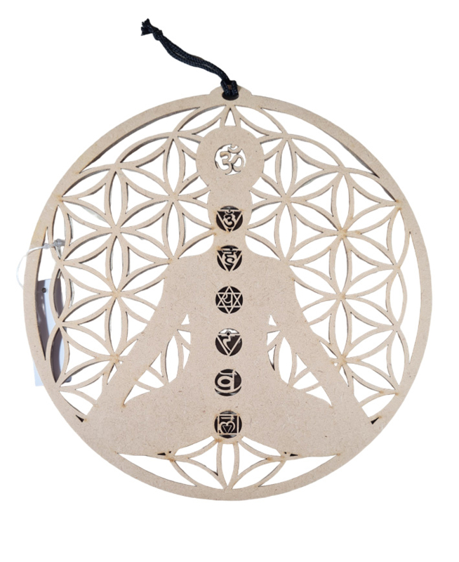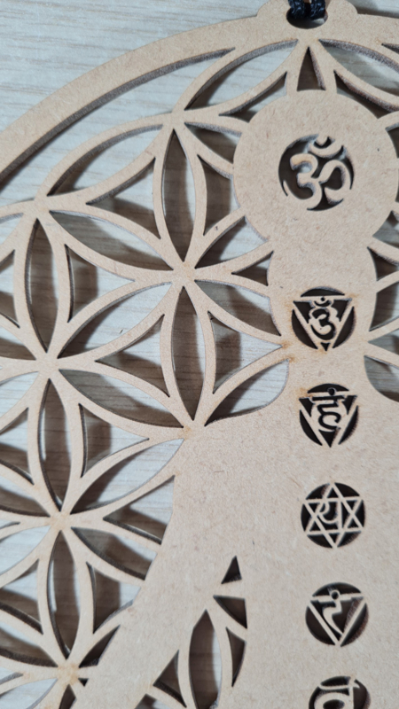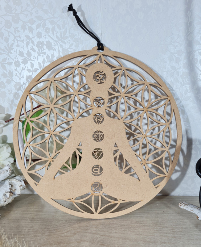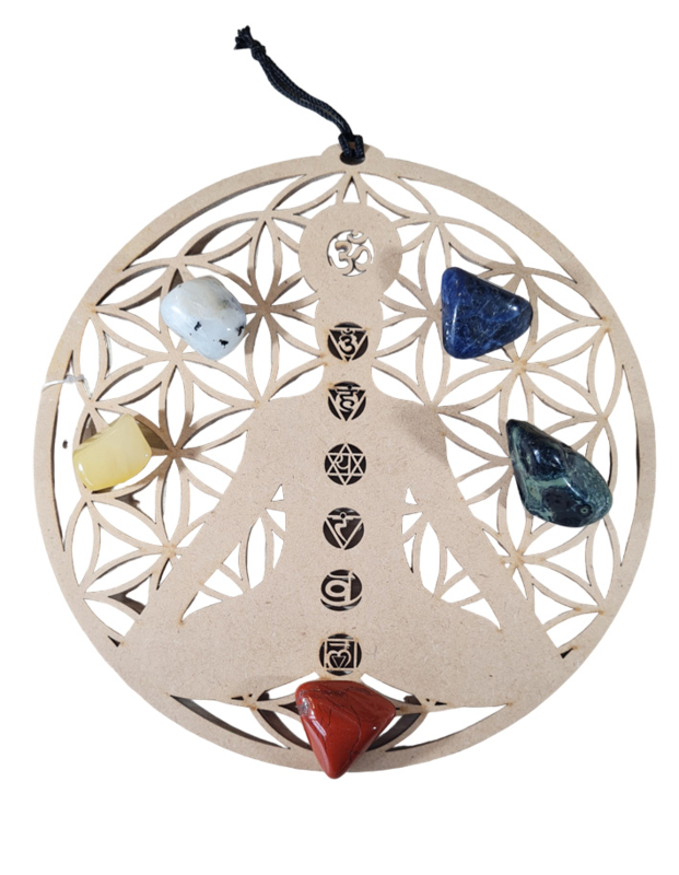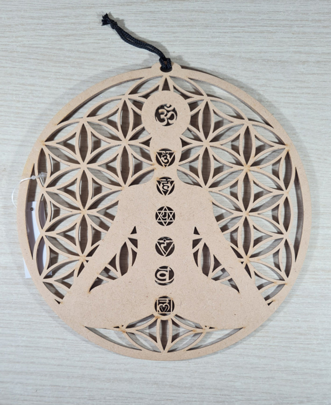 Artikelnummer: p OverzichtEen mooie raamhanger van de Levensbloem ( Flower of life) met een lichaam en hierop de bijpassende chakra's.