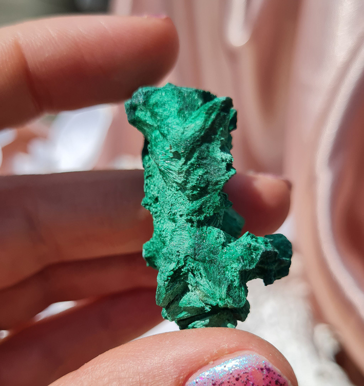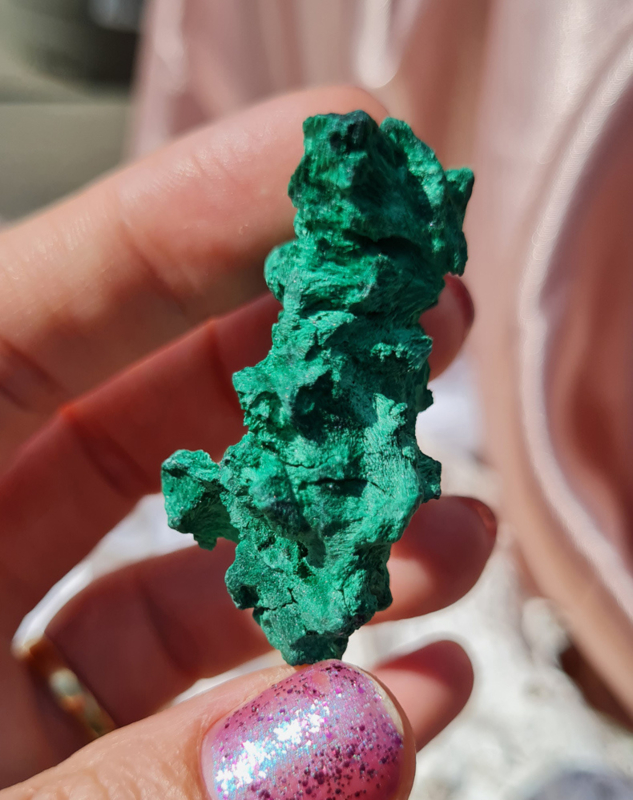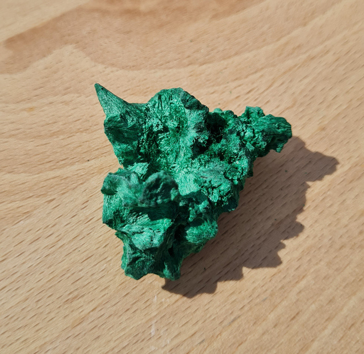 Deze ruwe vorm van malachiet staat ook wel bekend als zijde, fluweel of naaldvormige malachiet.
