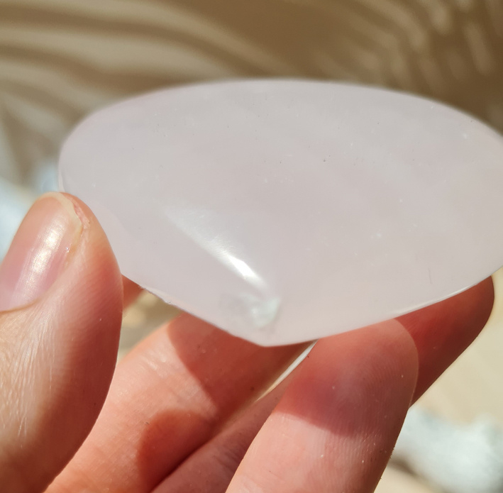 Het puntje bij deze mangano calciet is iets lichter van kleur en heeft een heel klein chipje eraf van 2mm. Niet zichtbaar, licht voelbaar.