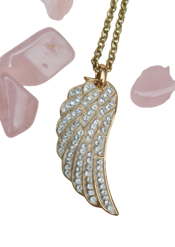 Een mooie met stras bezette vleugel in goudkleur. De stras steentjes zijn wit.