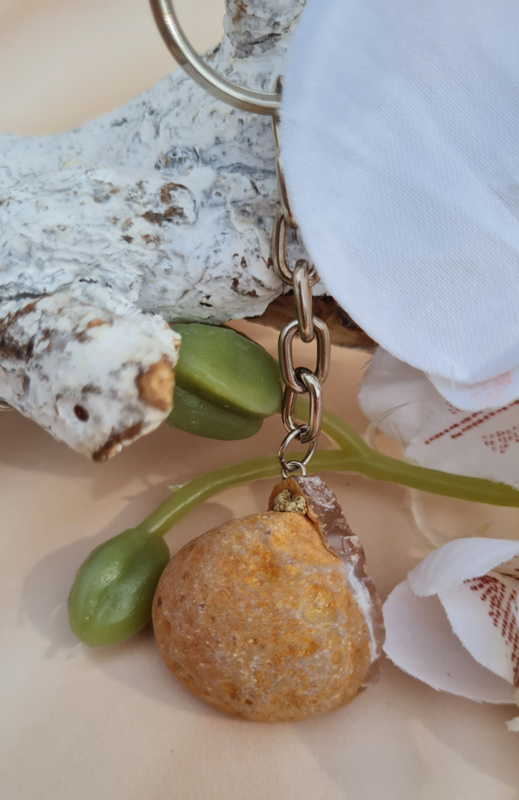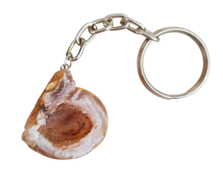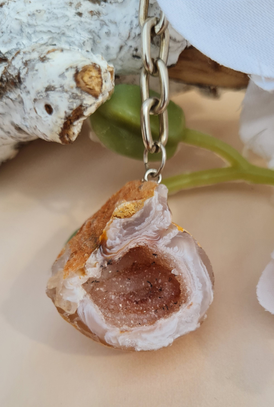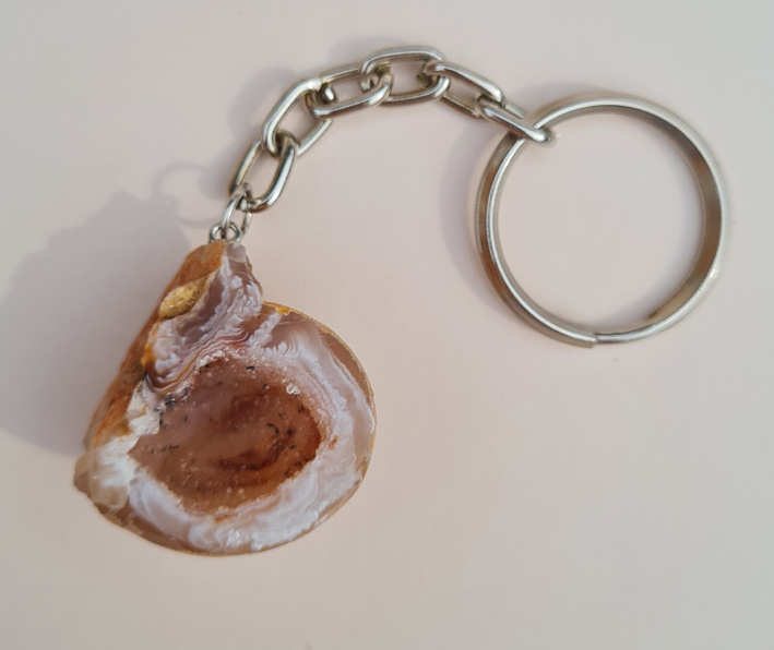 Deze sleutelhanger bestaat uit een (kleine) halve agaat geode die is gepolijst.