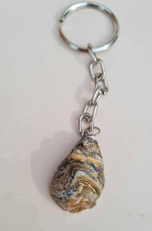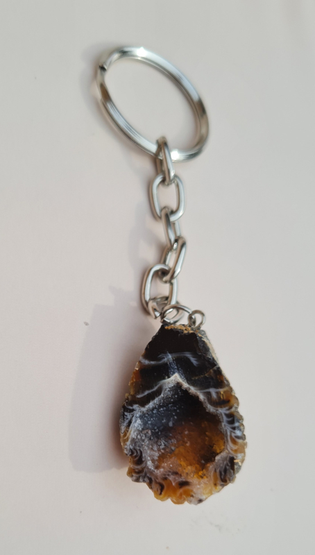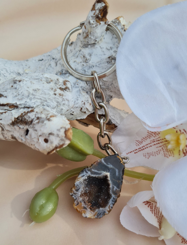 Deze sleutelhanger bestaat uit een (kleine) halve agaat geode die is gepolijst.