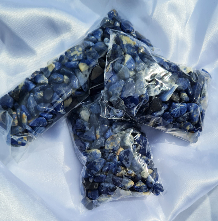 OverzichtEen zakje met sodaliet trommelstenen met een gewicht van 150 gram.