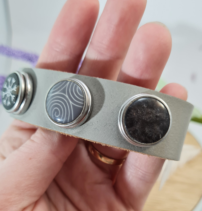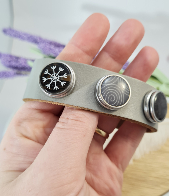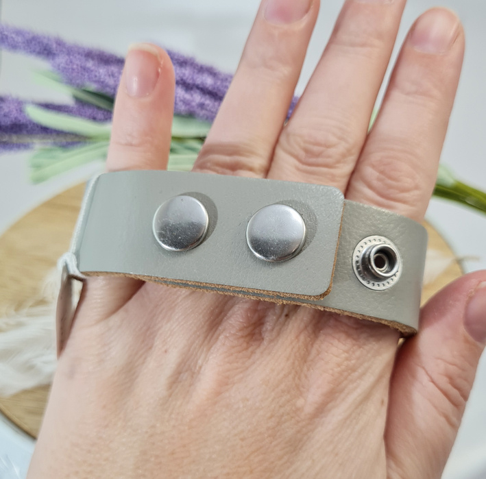 Artikelnummer: p OverzichtEen mooie armband van leer. Met drie clicks zoals hierboven afgebeeld. De clicks kun je verwisselen met andere clicks zo draag je steeds een andere armband. Met een grijze kleur leer.