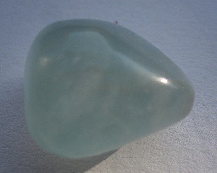 Mooi geslepen aventurijn. Nauwelijks glisjes. Vrij matte, melkachtige steen in de kleur aquamarijn. Als je goed kijkt zie je enkele plekjes met mooie kleurschakeringen als bij een labradoriet.