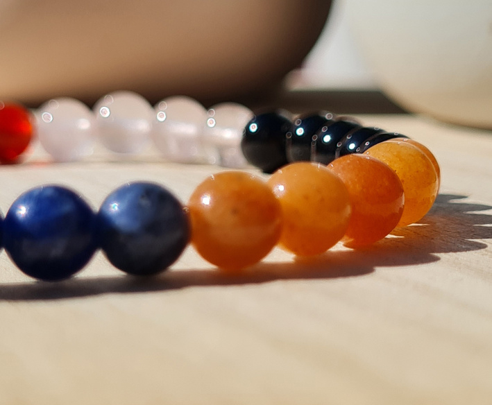 Groene aventurijn, Bergkristal, Sodaliet, Oranje Aventurijn, Zwarte Obsidiaan, Rozenkwarts en Oranje Agaat ( de donkere)