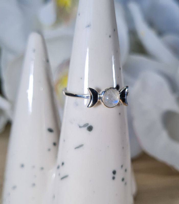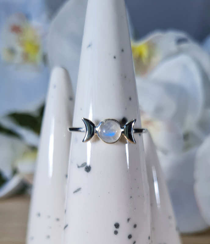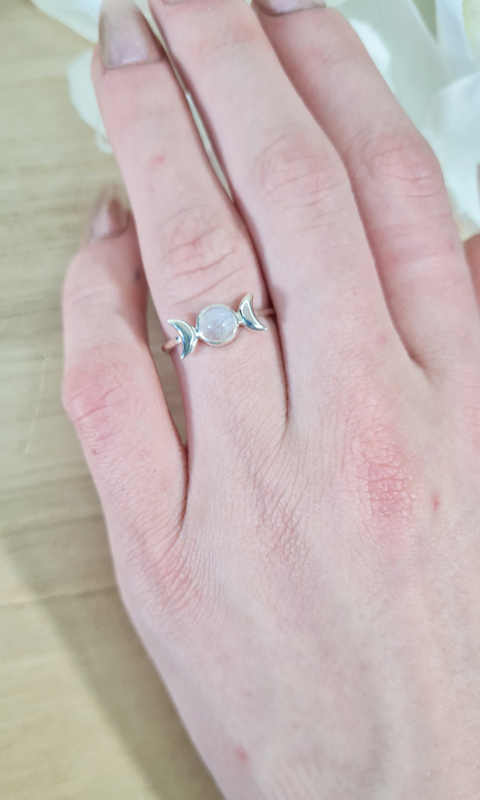 Artikelnummer: 40451 - pv OverzichtEen prachtige edelsteenring met de drievoudige maan. In het midden zit een Maansteen.