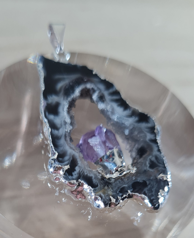De agaat geode heeft een oog en is niet doorboord. Het oog en de klem zijn beide in zilverkleur.