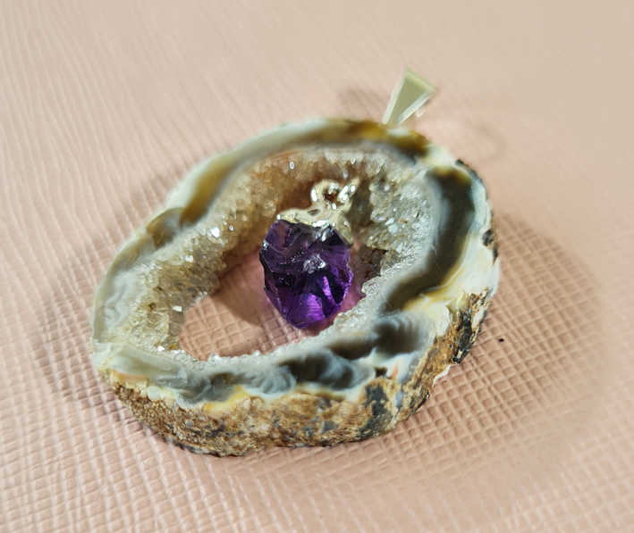 Artikelnummer: no.2 - 5482 p OverzichtEen prachtige Agaat slice met hierin een hangende Amethist steen.