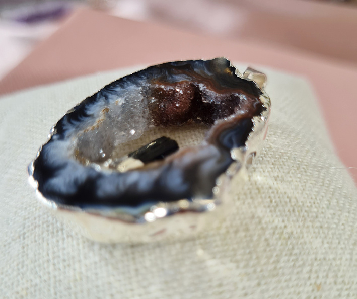 Artikelnummer: no.2 - 5486 p OverzichtEen prachtige Agaat slice met hierin een staande Toermalijn steen. De rand is verzilverd.