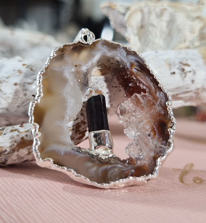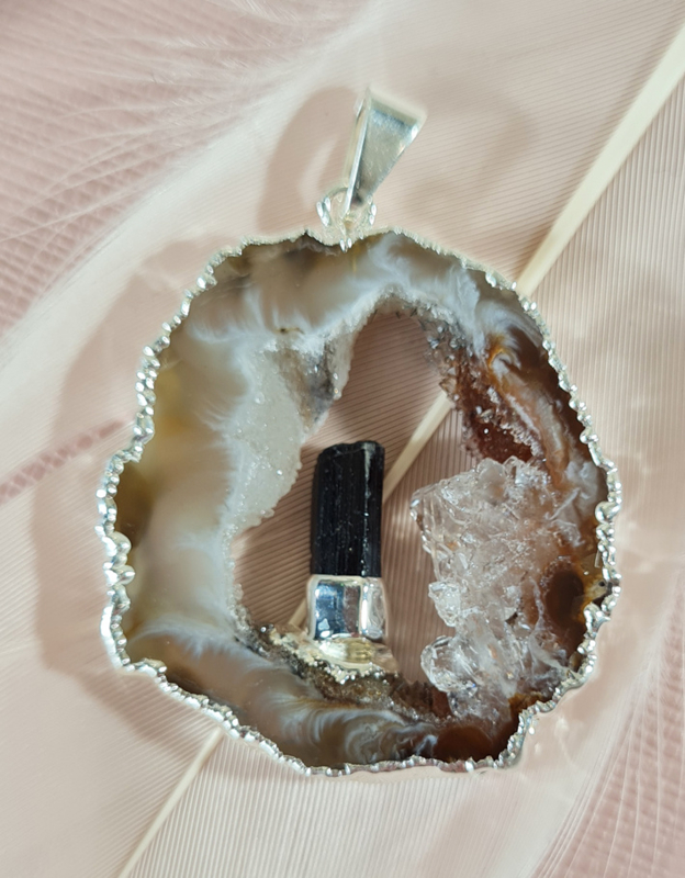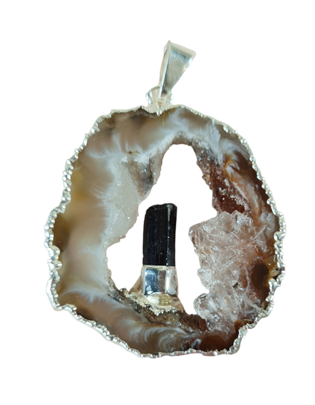 Edelsteen Hanger Agaat Geode Staande Toermalijn Verzilverd