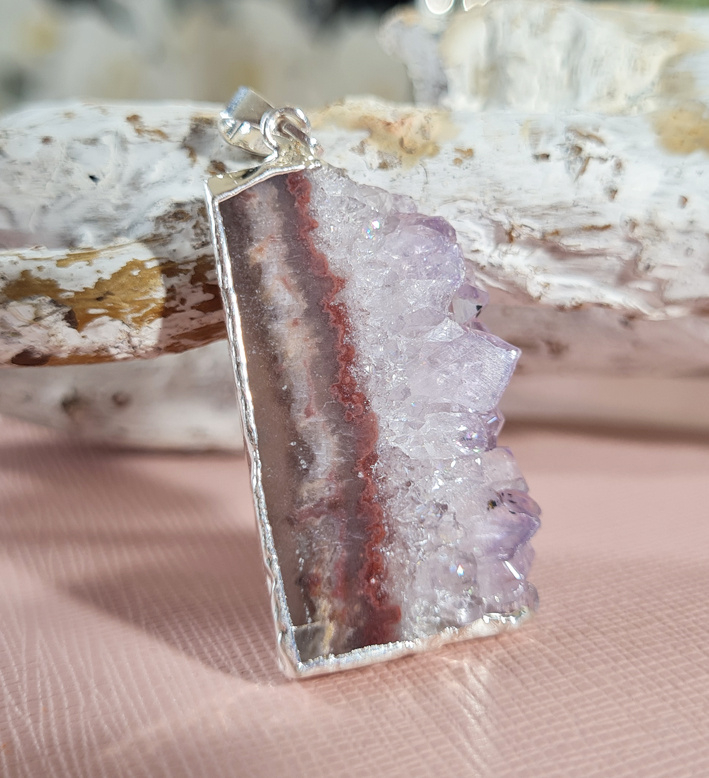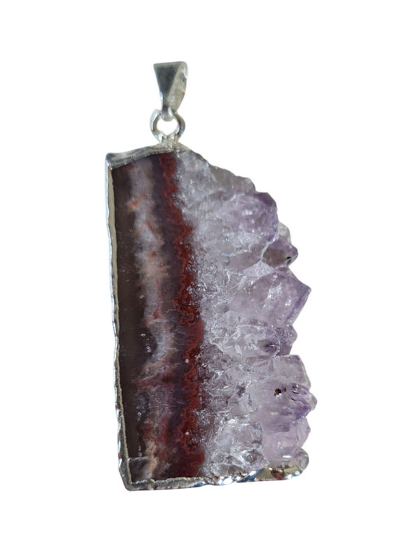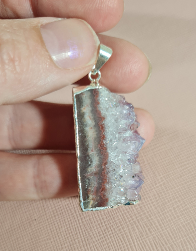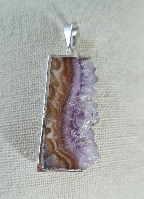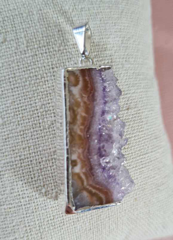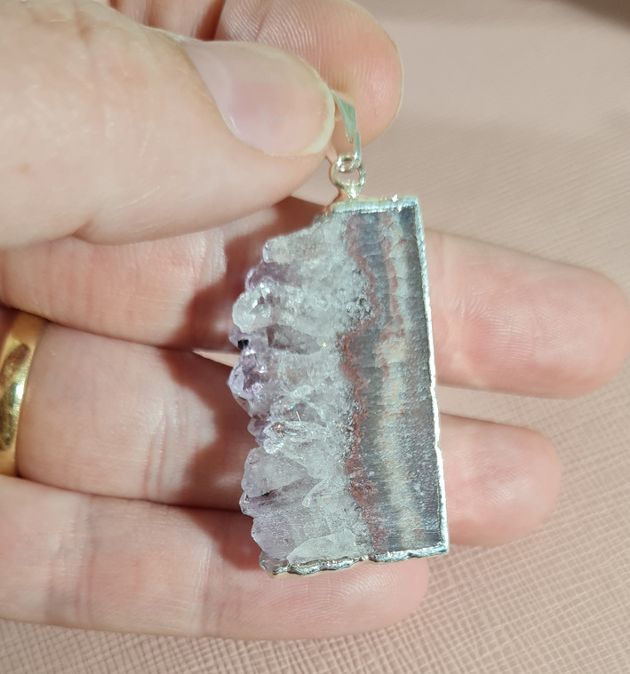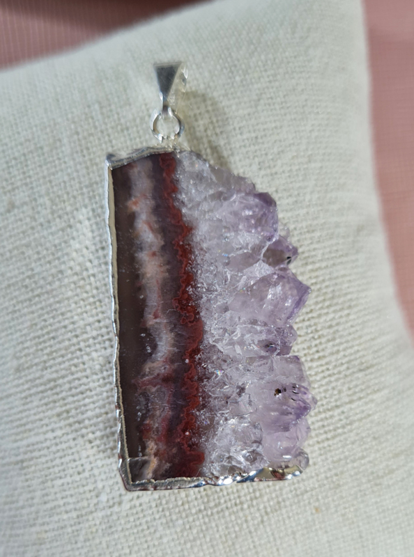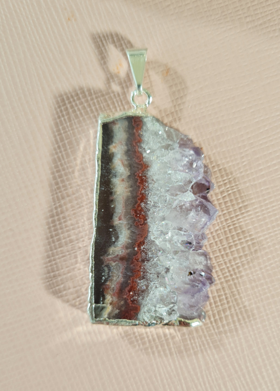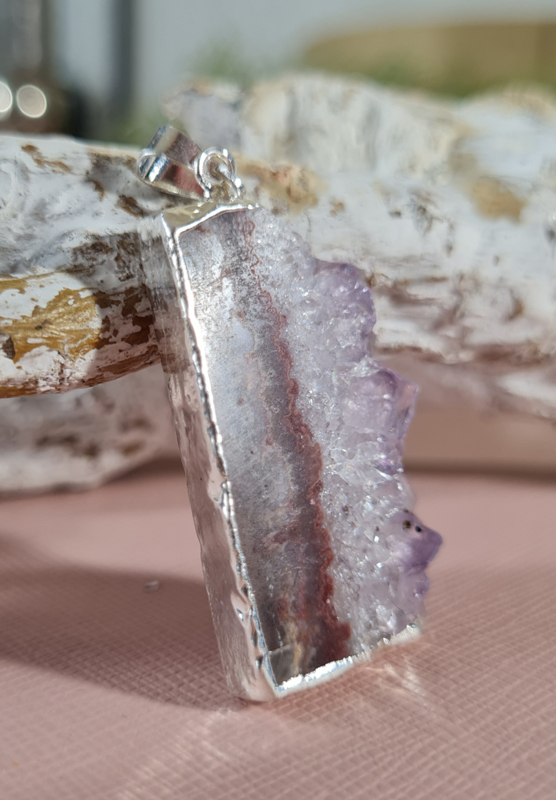 Artikelnummer: no.2 p OverzichtEen prachtige hanger van een Amethist schijf. De zijkant is verzilverd voor een perfecte afwerking, het oogje is hiermee ook bevestigd.