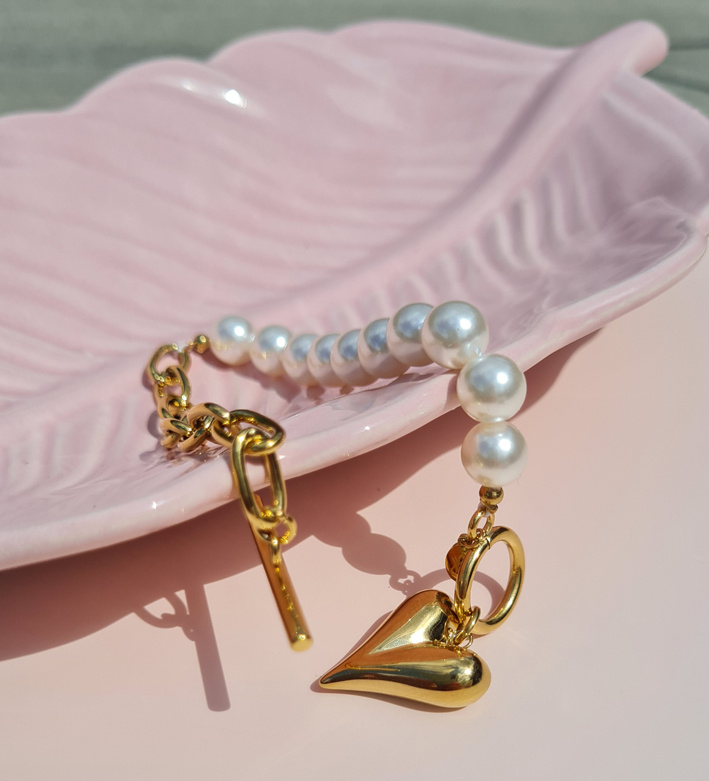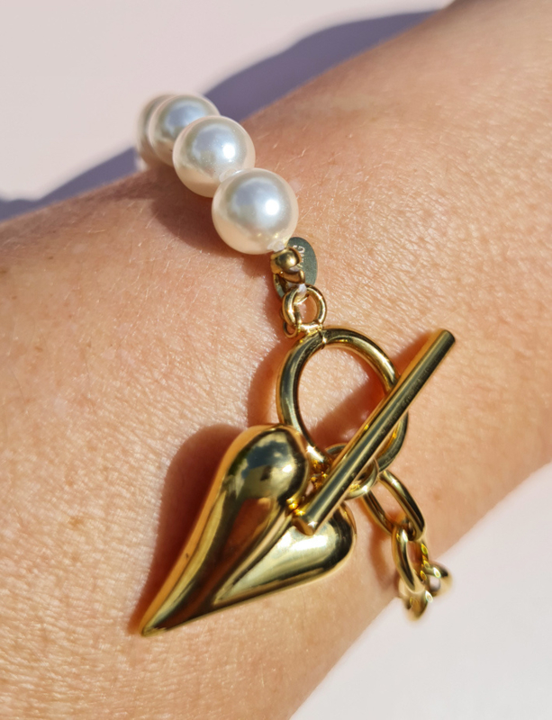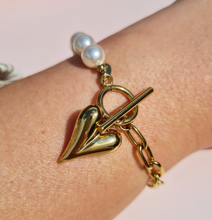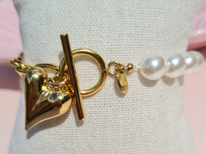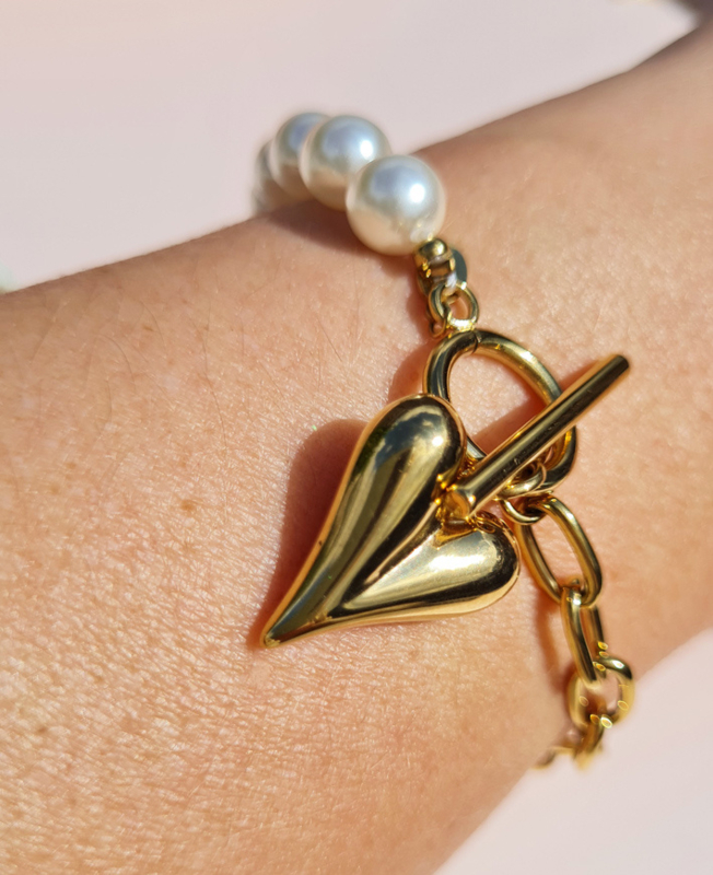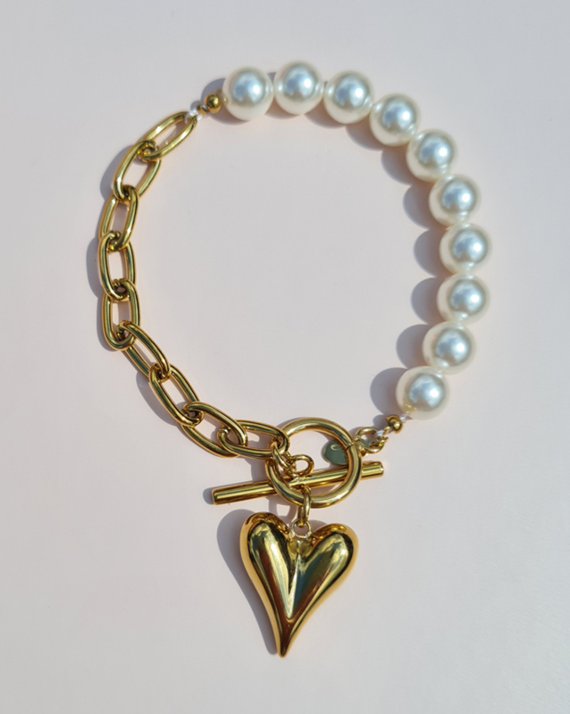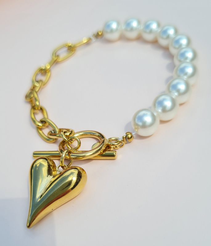 OverzichtEen prachtige armband met aan een zijde mooie parels en aan de andere zijde is van RVS gemaakt. Met een mooie grote sluiting met hieraan een prachtig hart.