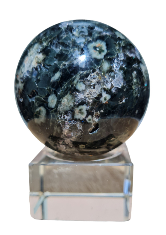 Een prachtige edelsteenbol van Oceaan Jaspis met een doorsnede van 5,7 cm. De bol heeft een prachtig patroon met mooi druzy pockets en kwarts in zich.