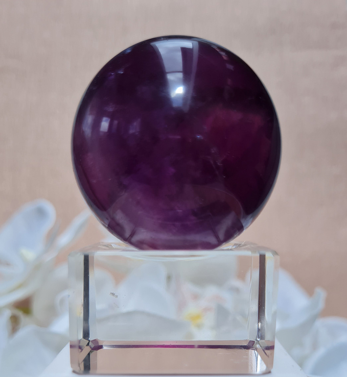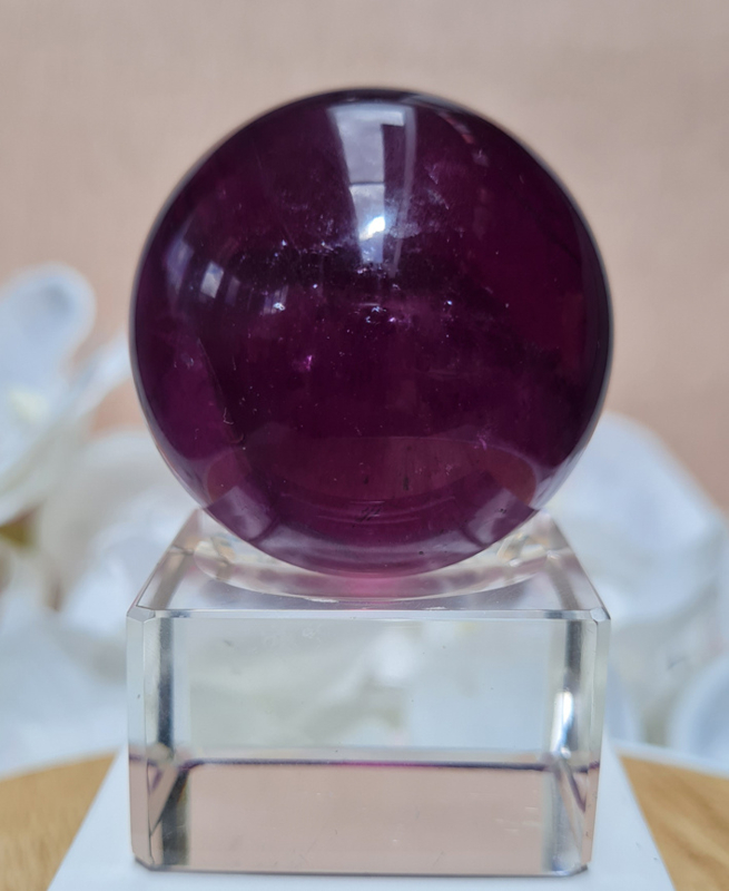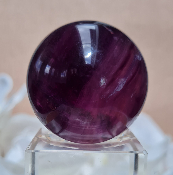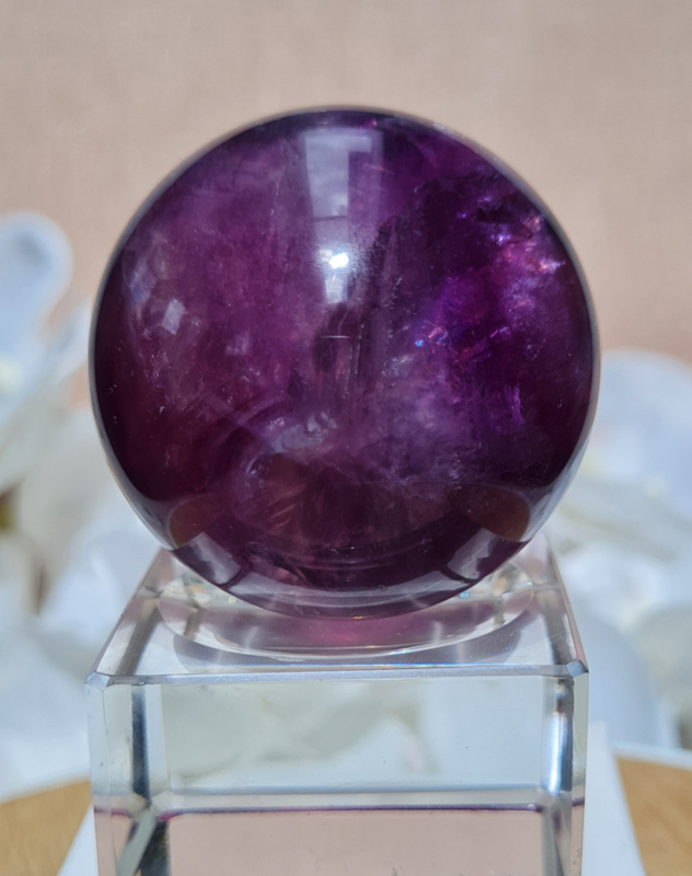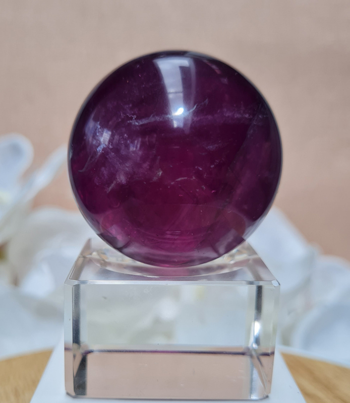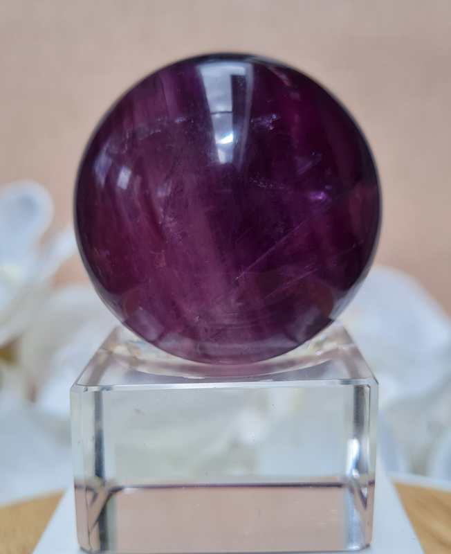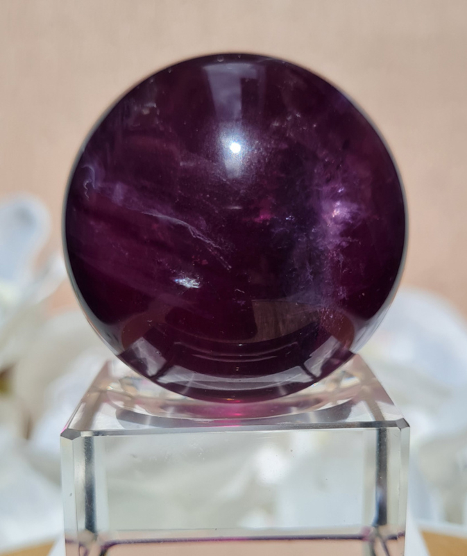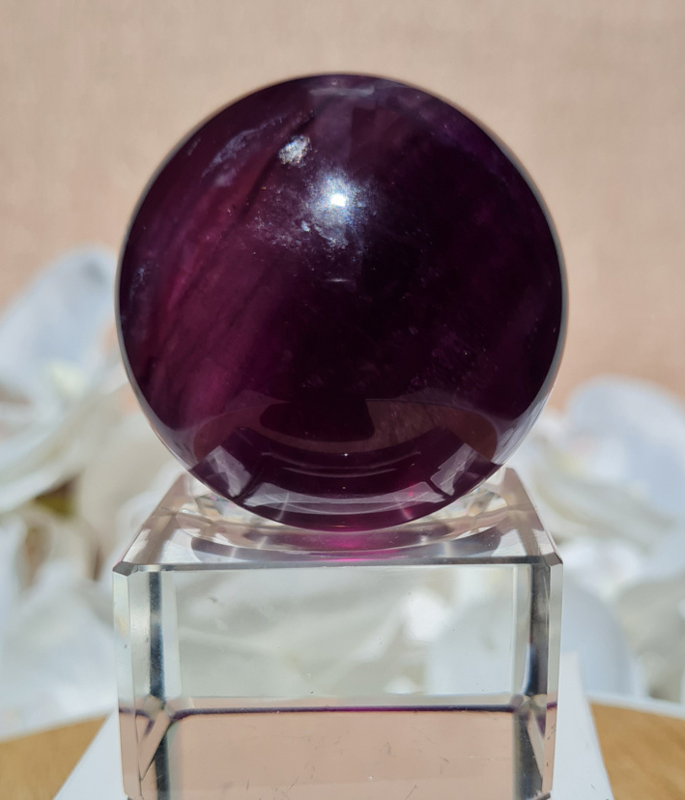 Een prachtige dieppaarse fluorietbol met een mooi lijnenspel hierin. De fluoriet heeft mooie regenbogen in zich.