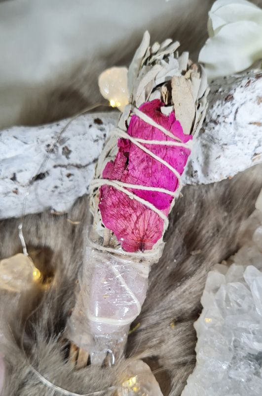 De stick bevat Witte Salie om te reinigen, een rozenkwarts steen en een rozenblaadje.