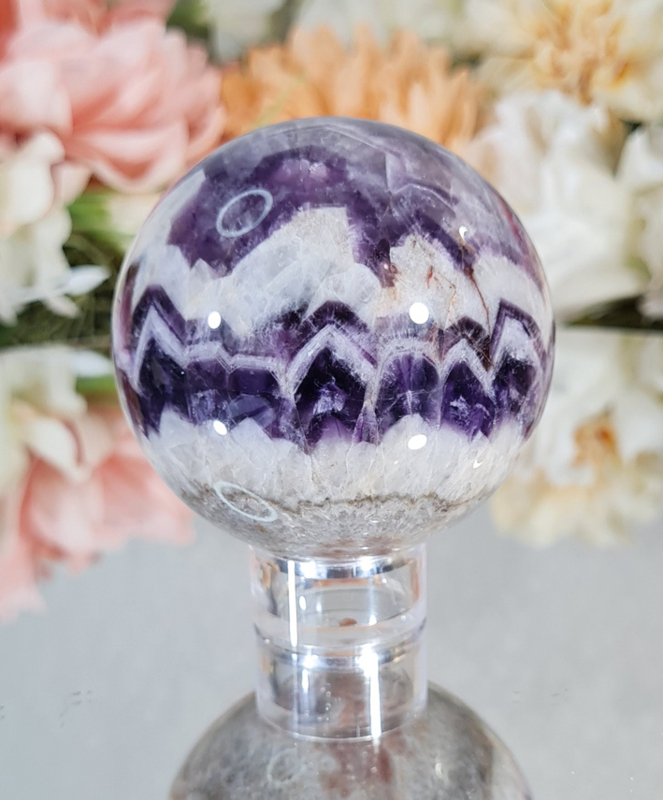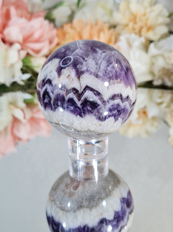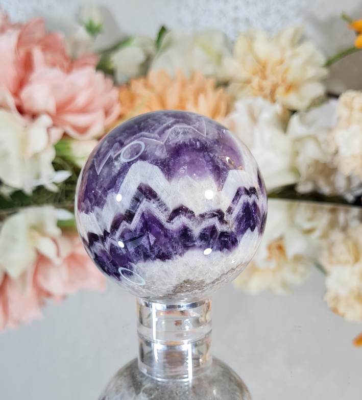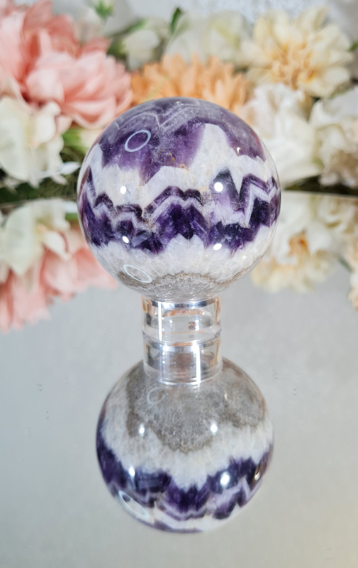 Deze gave bol heeft een super mooi wit en paars patroon in zich. Met de mooie kwarts lagen en Amethist lagen wordt je bijna betoverd.