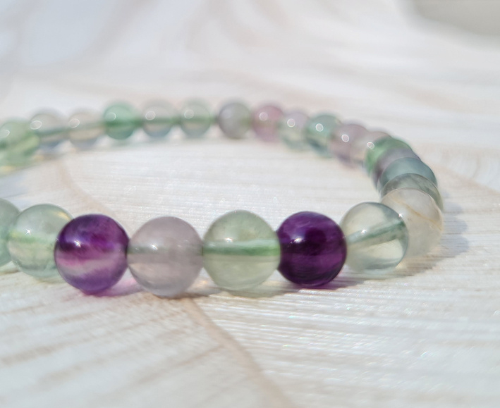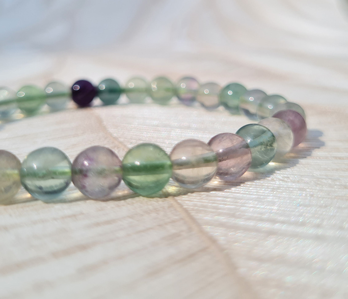 Deze armband is geregen op dubbel elastiek voor extra stevigheid. Hij heeft mooie kralen van Fluoriet in paars, groen en blauw. Een prachtige combinatie van kleuren. De armband past goed om de gemiddelde pols.