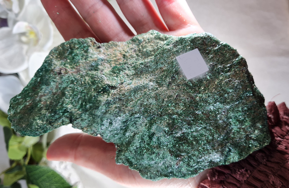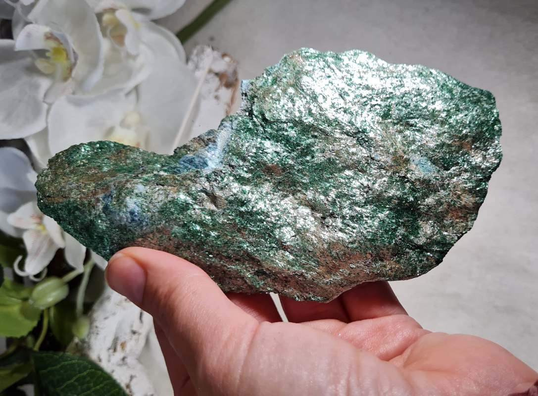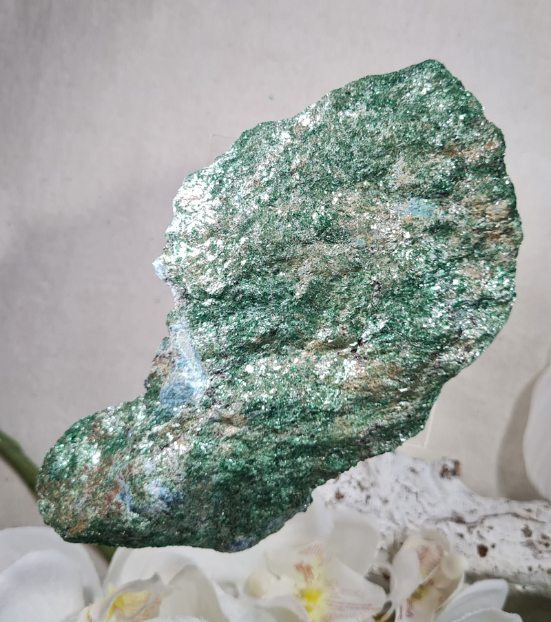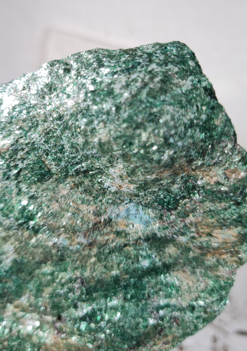 OverzichtEen prachtige ruwe Fuchsiet. Deze onbewerkte Fuchsiet is werkelijk prachtig! Met zijn mooie groene kleur en glans en glimmers betoverd deze steen je gelijk.