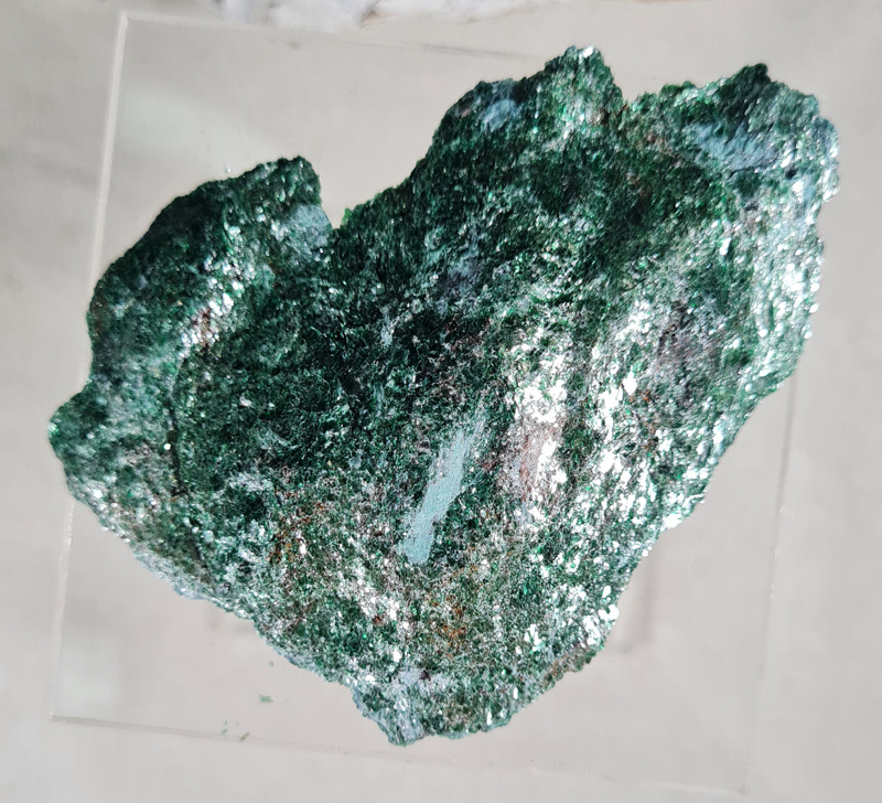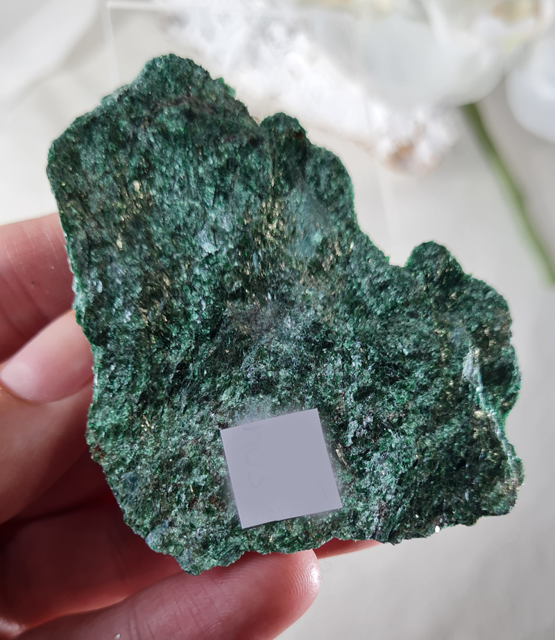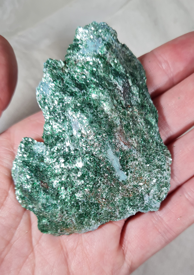 OverzichtEen prachtige ruwe Fuchsiet. Deze onbewerkte Fuchsiet is werkelijk prachtig! Met zijn mooie groene kleur en glans en glimmers betoverd deze steen je gelijk.