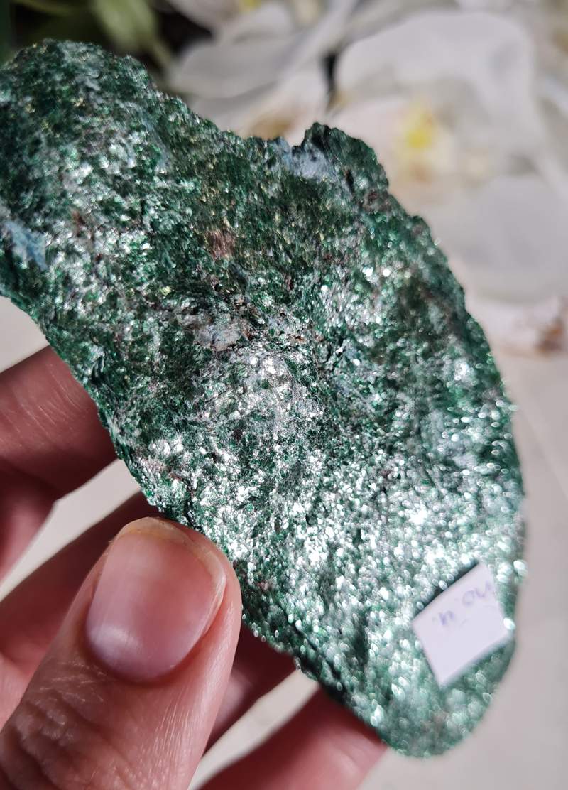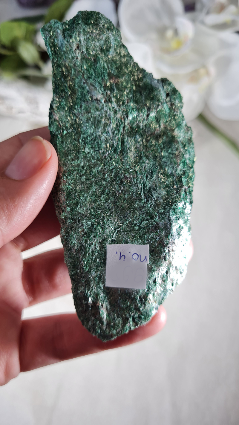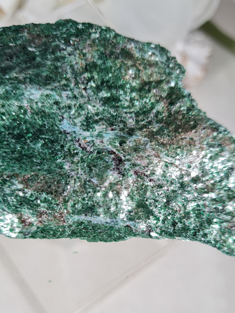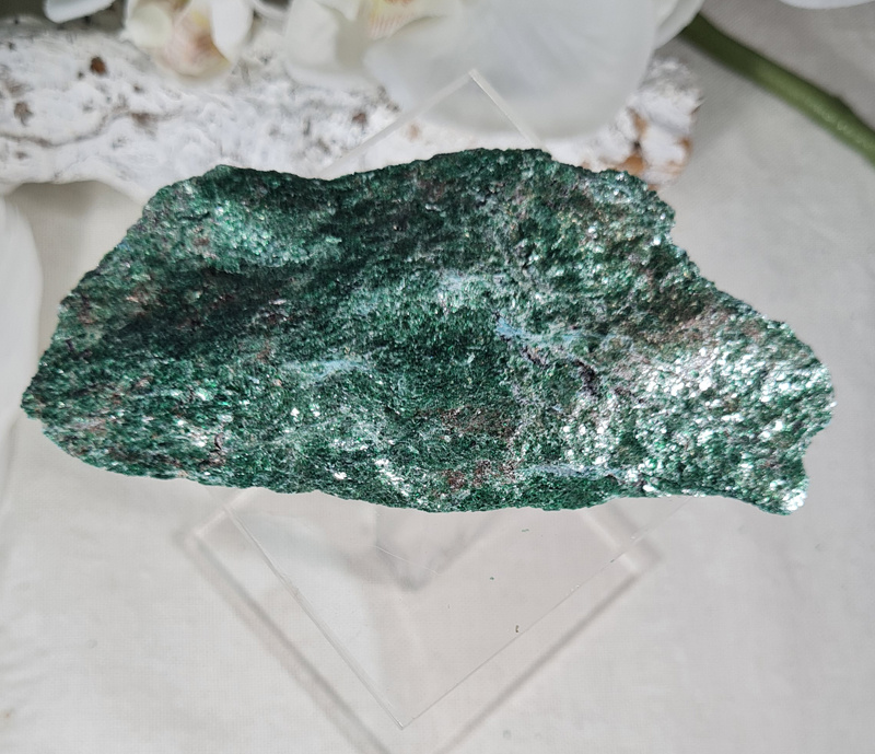 OverzichtEen prachtige ruwe Fuchsiet. Deze onbewerkte Fuchsiet is werkelijk prachtig! Met zijn mooie groene kleur en glans en glimmers betoverd deze steen je gelijk.