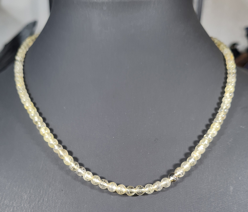 Artikelnummer: td OverzichtEen prachtige kralenketting van Rutielkwarts 4 mm kralen. Deze mooie kralen zijn rond geslepen. De edelsteenketting heeft een lengte van 45 cm. Bij Rutielkwarts zie je allemaal kleine gele of koperachtige naaldjes in de kraal. Dit heeft een mooi effect op de ketting