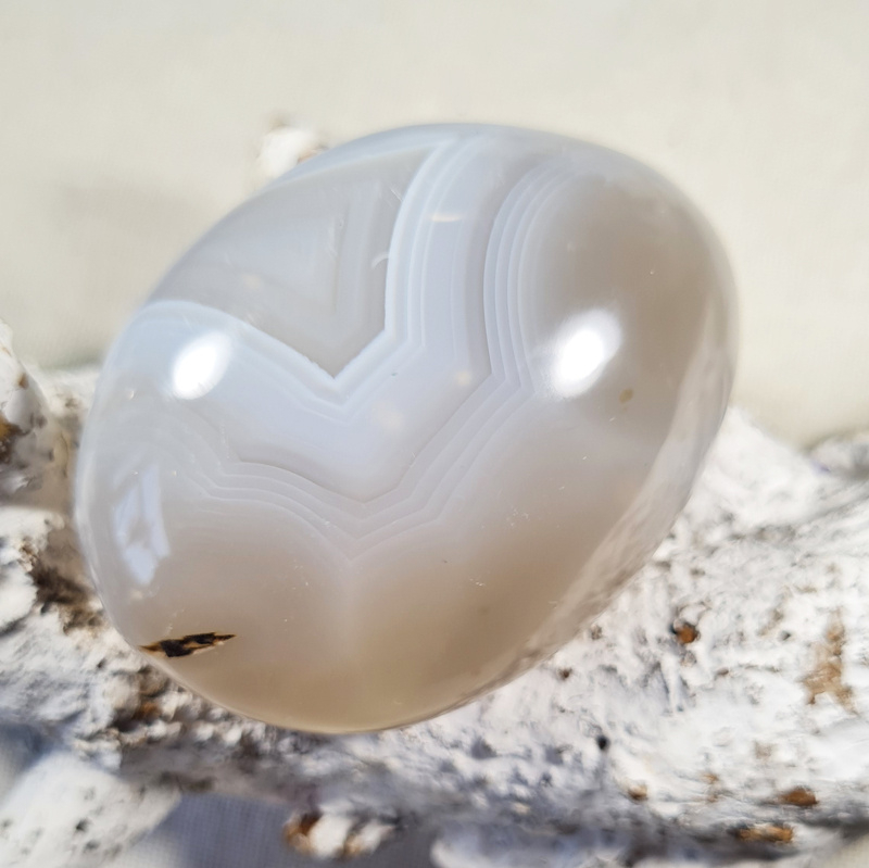 Deze Agaat heeft mooie witte, beige en grijze kleuren. Met een mooi bandenspel.