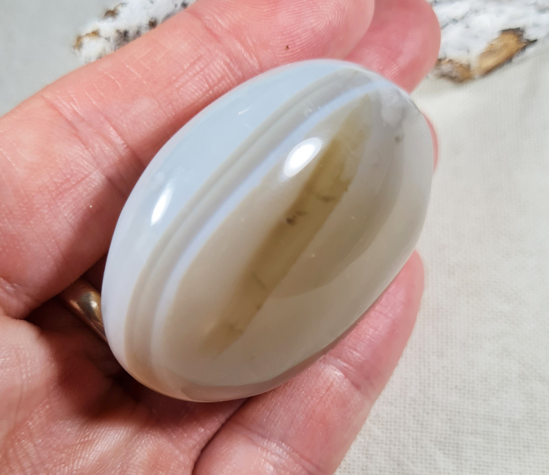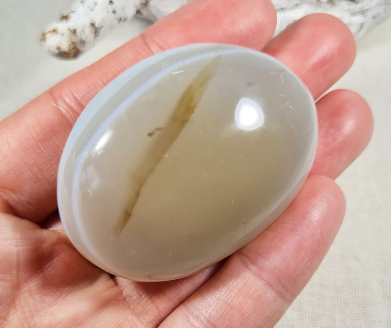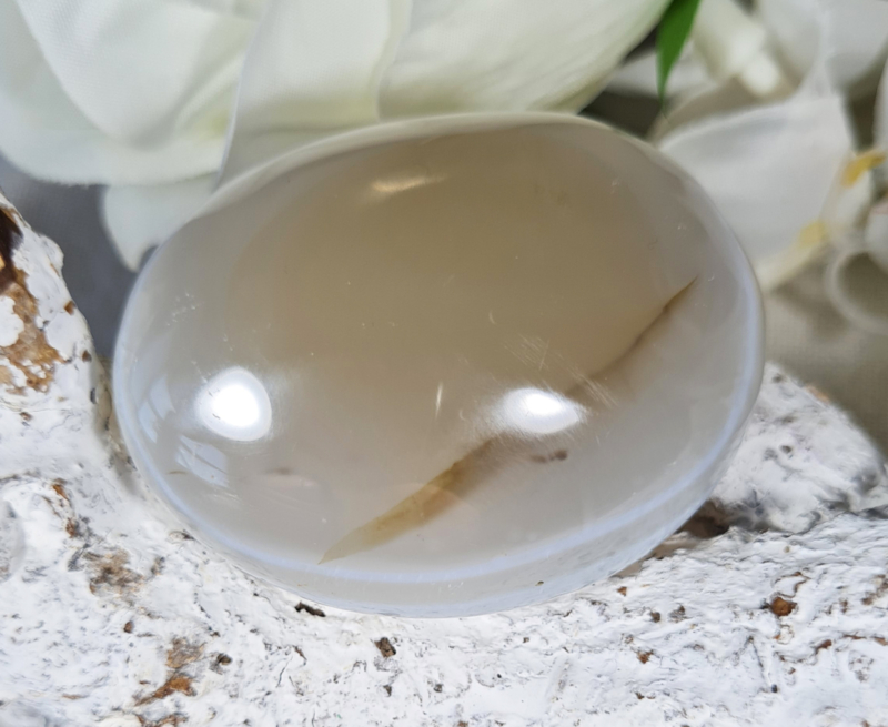 Een prachtige Agaat handsteen van 5 cm. Deze Agaat heeft zijn mooie banden in grijs aan de zijkant van deze vrij ronde steen. De steen is wat transparant waardoor je goed in de steen kunt kijken. Hier is de steen beige bruin, met een schuine bruine band. De andere kant is grijsblauw van oppervlak. Een bijzonder stuk Agaat dat niet mag ontbreken in jouw collectie.