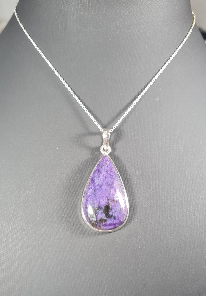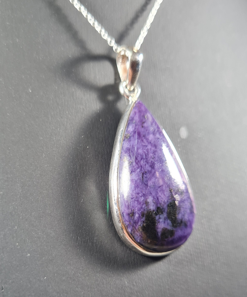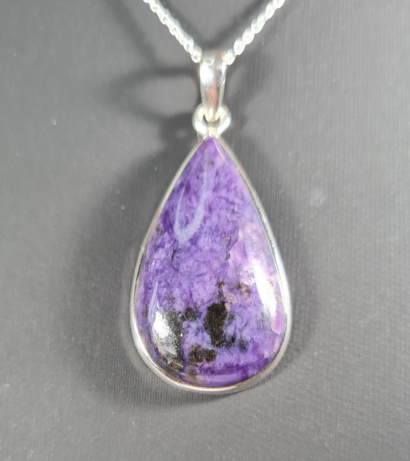 Een prachtige, handgemaakte hanger met Charoiet – een edelsteen die je niet meer uit je gedachten krijgt. De diepe paarse kleur met subtiele donkere insluitingen maakt deze steen opvallend en uniek. De steen is fraai geslepen in een elegante druppelvorm die prachtig om je hals zal vallen.