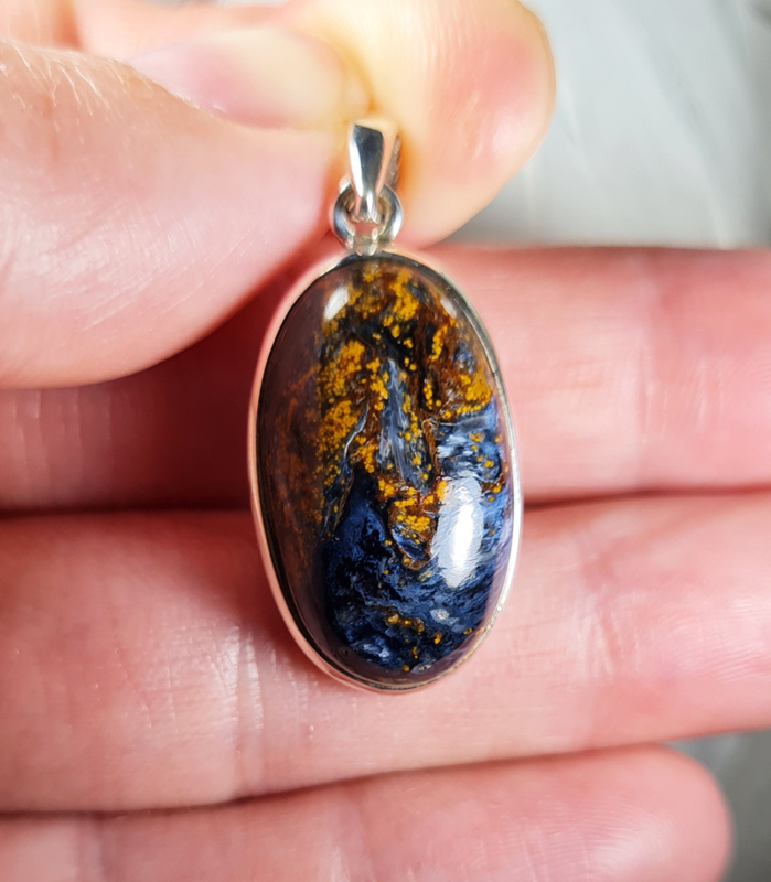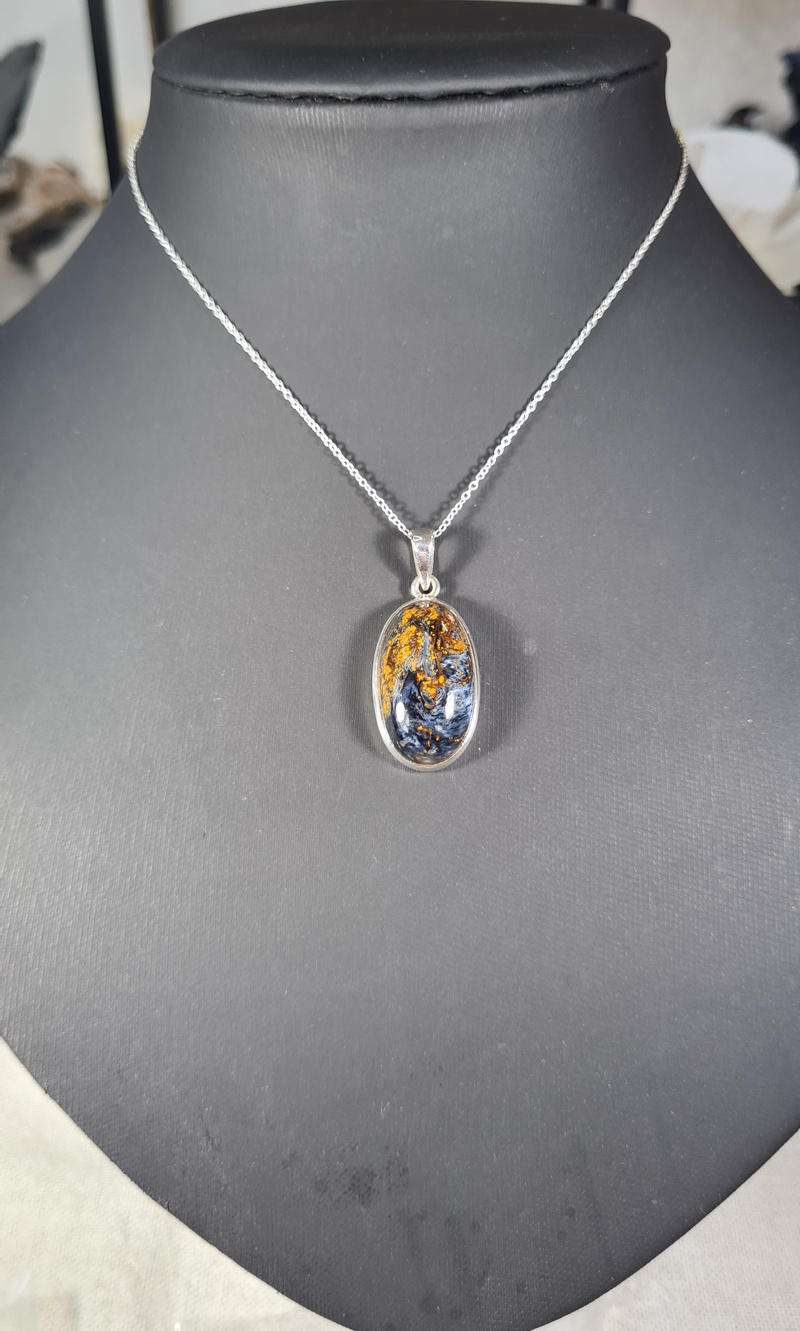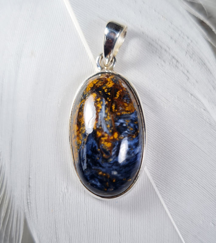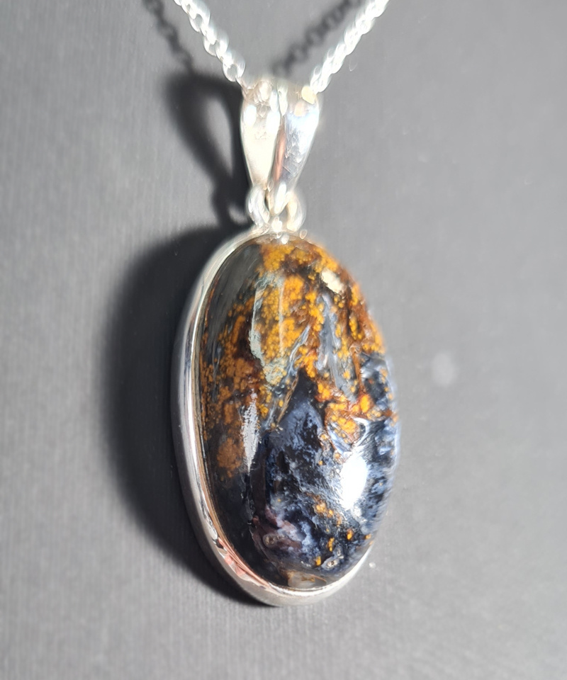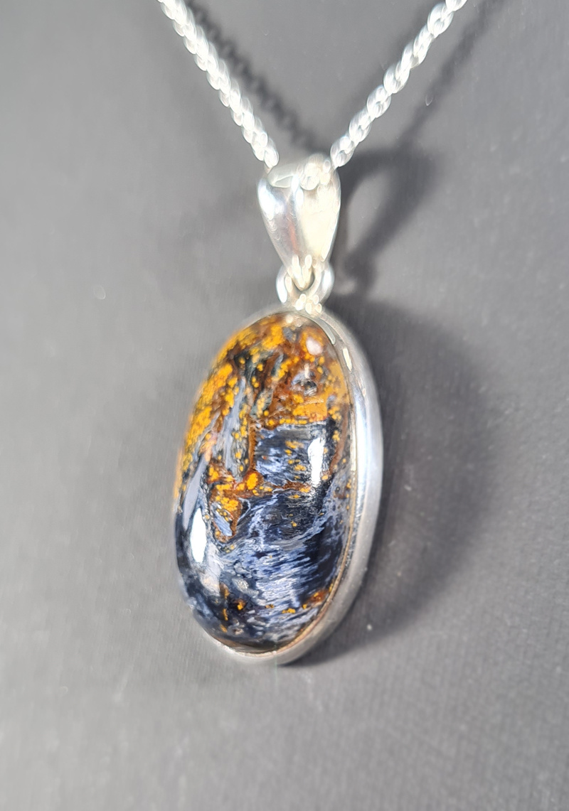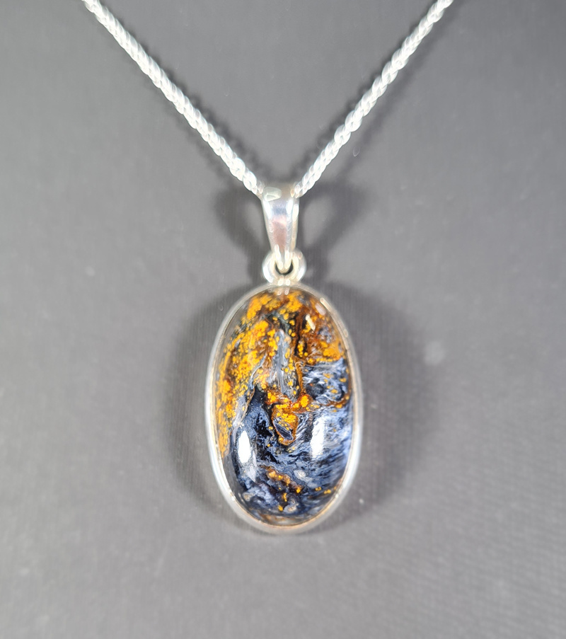 Artikelnummer: wmp OverzichtEen prachtig zilveren hanger van Pietersiet met een mooie geslepen steen. De steen heeft een mooie ovale vorm. Aan de bovenzijde van de hanger zit wat oranje kleur en aan de onderzijde blauw/grijs tot bijna zwart. In deze kleur zit een mooie blauwe flash.