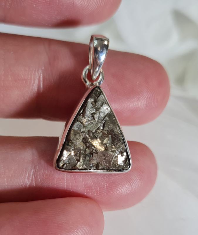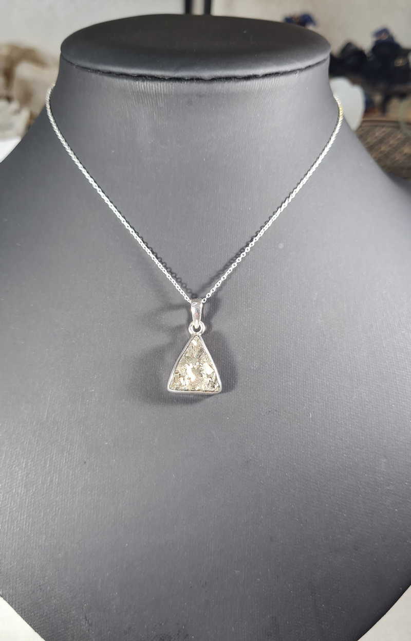 Deze prachtige zilveren hanger met een glanzend Pyriet druzy steentje is echt een unieke eyecatcher. De Pyriet is geslepen in een elegante driehoeksvorm en heeft die zachte, warme goudkleur die meteen opvalt. Perfect om subtiel en opvallend tegelijk te zijn!