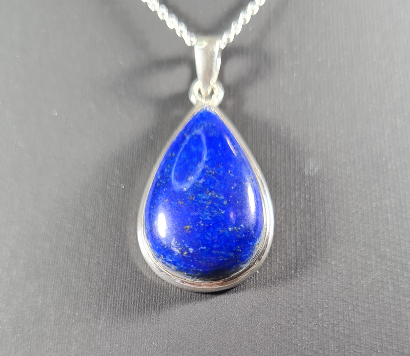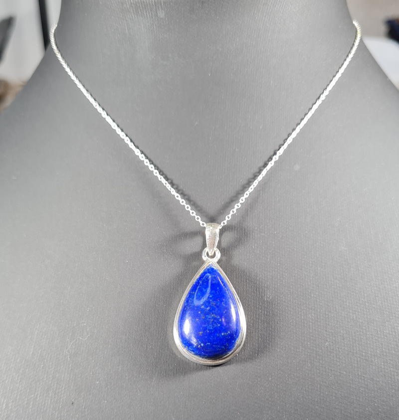 Een prachtig zilveren hanger van Lapis Lazuli, een mooie geslepen steen. De steen heeft een mooie diep blauwe kleur met kleine pyriet glinsters erin. De hanger is in een druppelvorm geslepen.