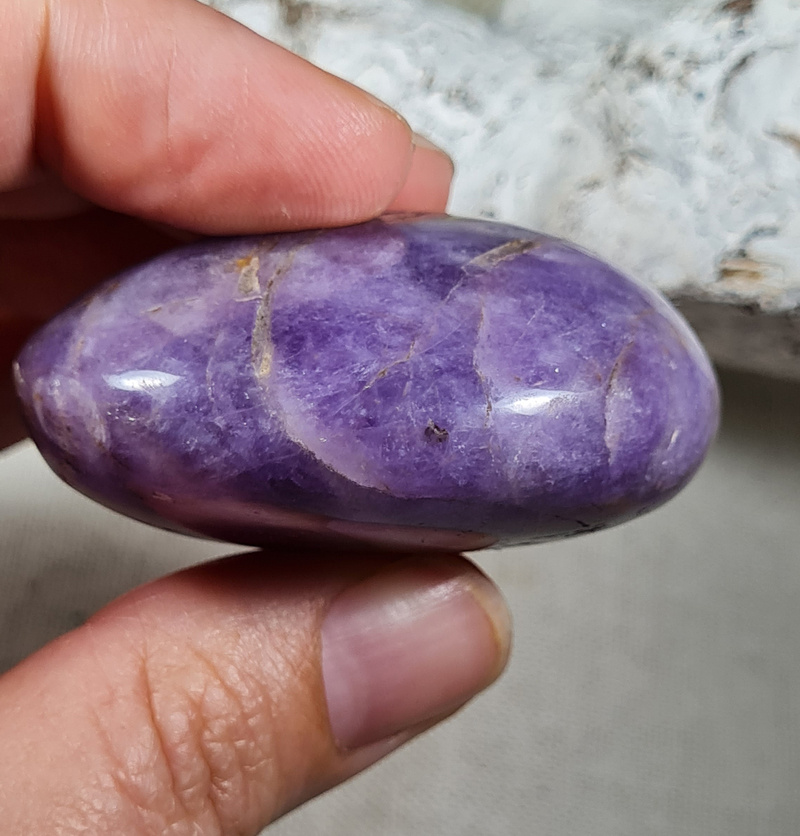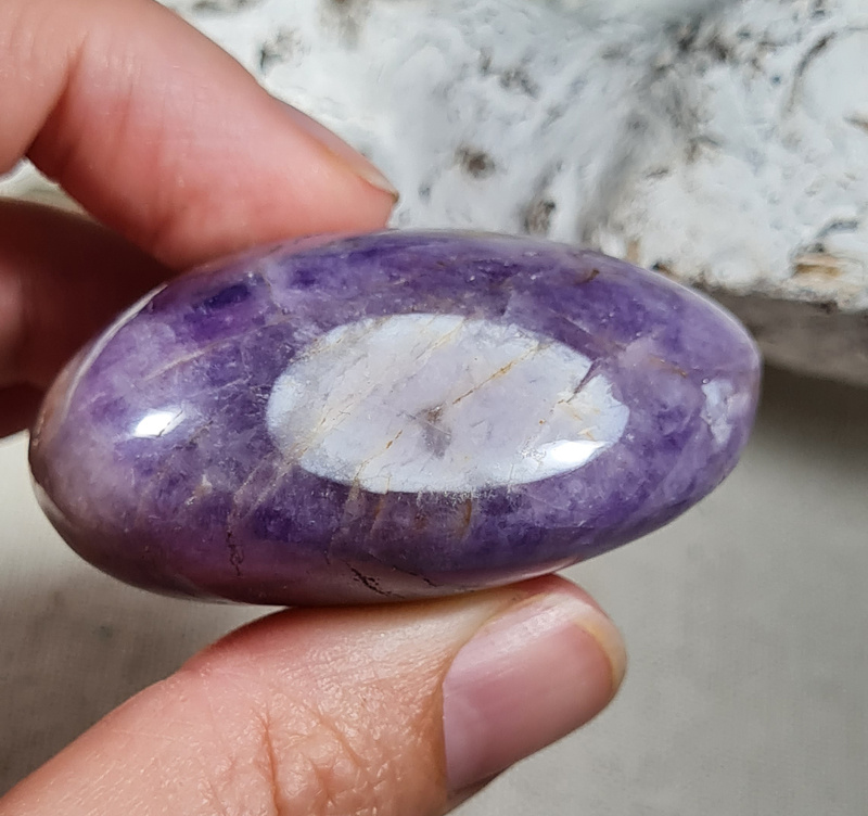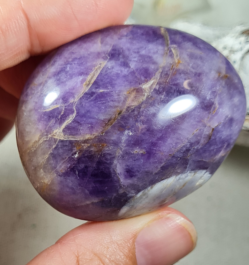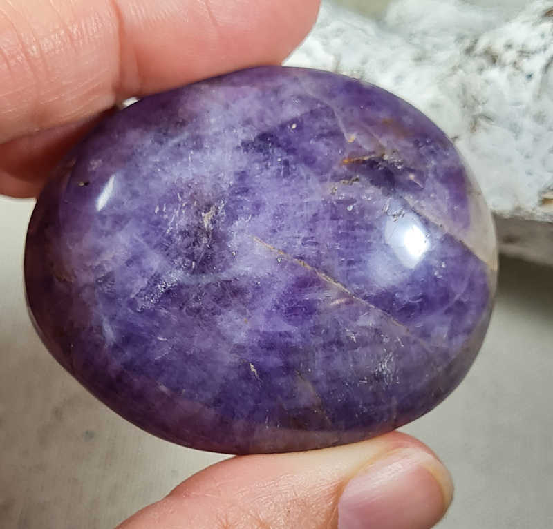 Deze Amethist heeft verschillende tinten paars in zich. Ook een klein wit stukje. Heeft aan een zijde een mooi reflecterende glans in zich. De steen is vrij glad gepolijst. Al heeft hij wat breuklijnen in zich. Al met al een fijne grotere handsteen die behoorlijk interessant is.