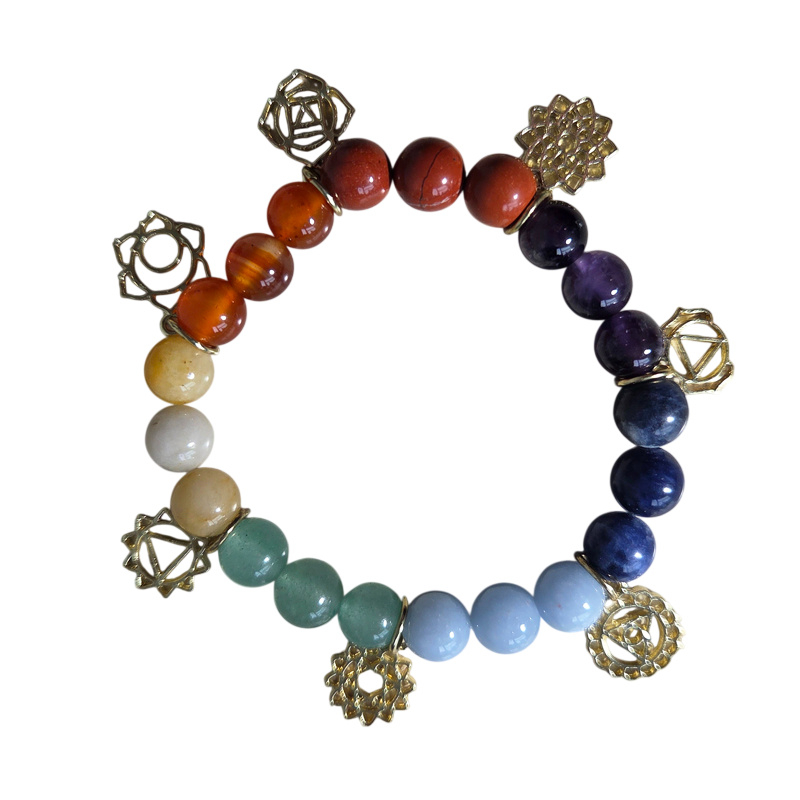 Edelsteen Armband Chakra stenen en bedels 8 mmEen gave armband van edelstenen in de chakra kleuren met mooie goudkleurige metalen bedels van de 7 chakra's.