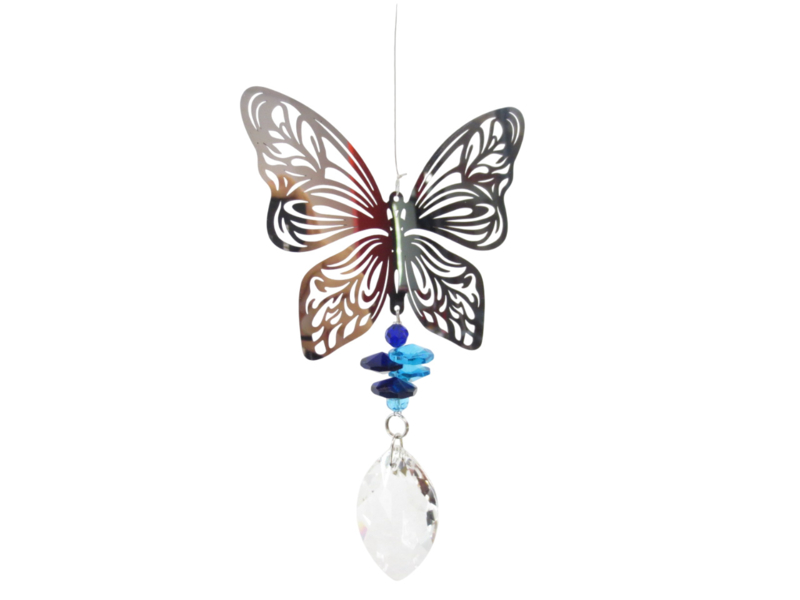 Raamhanger -Cosmo Spinner Vlinder - met regenboog glaskristalRaamhanger vlinder kopen. Een prachtige cosmo spinner in de vorm van een vlinder met hieronder blauwe glaskraaltjes en een regenboogkristal.