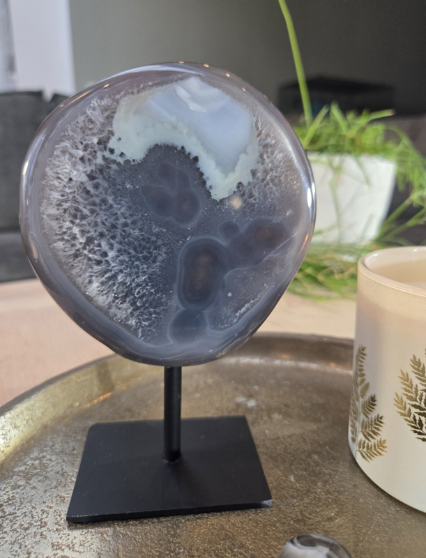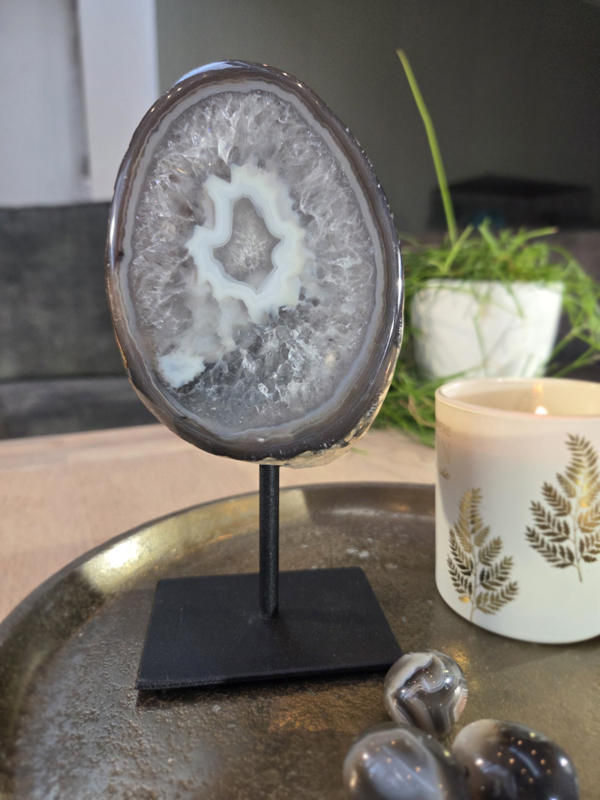 Een agaat op standaard is een natuurlijke agaat geode of schijf die door vakmensen zorgvuldig is gezaagd. Hierdoor worden de binnenste kristalpockets, die vaak uit mooie glinsterende kristallen bestaan zichtbaar gemaakt. Meestal wordt hij erna gepolijst en op een stevig metalen voetstuk bevestigd. Zo kan het echt een object worden die je doet denken aan een stuk kunst. Maar dan kunst door Moeder Aarde gecreëerd. Dit maakt ook iedere agaat geode op standaard weer anders. Ze hebben allemaal hun eigen patroon.