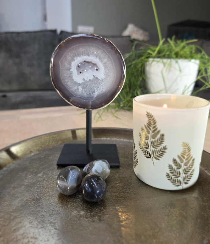 Vooral bij de lichte agaat stenen zoals de agaat op standaard in beige kleur, voel je deze neutraliteit enorm goed.